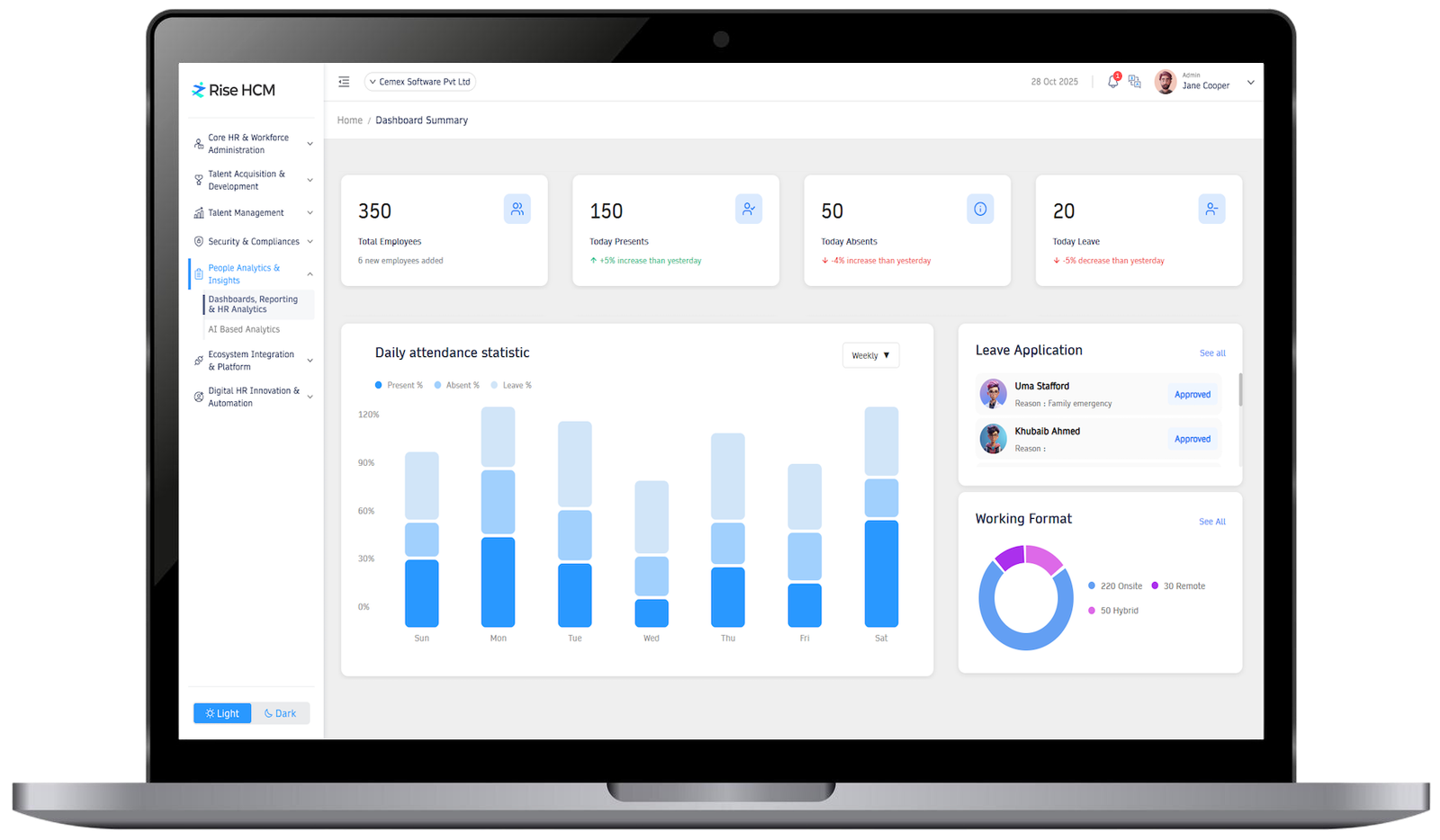 Get a 360° view of your workforce through dynamic dashboards and customizable reports that translate complex HR data into clear, visual intelligence.